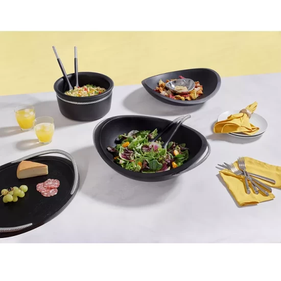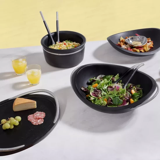 Artful coils formed of brightly gleaming chrome decorate the sculptural pieces in Nambé’s striking collection.