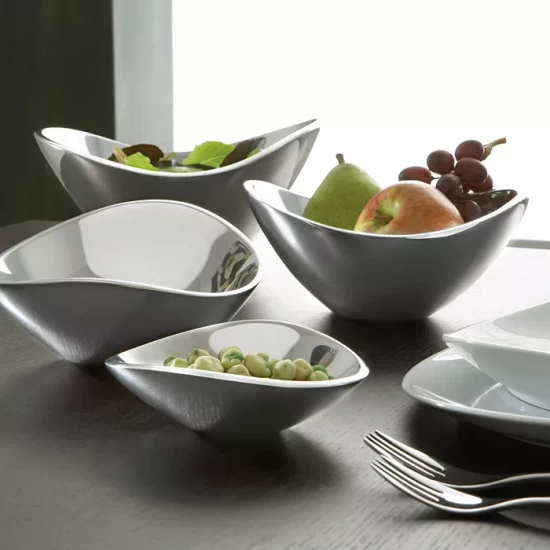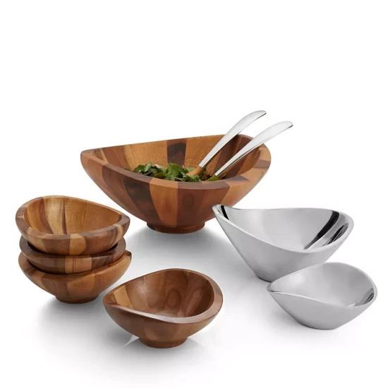 Flowing silhouettes and a juxtaposition of wood and metal create an eye-catching collection from Nambé. Acacia, a dense, durable hardwood, glows with warmth, while polished metal details offer a striking focal point.