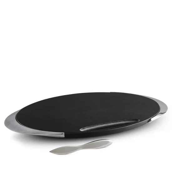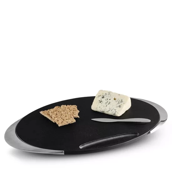 - The cheese board features gleaming Alloy handles that follow the curve of its oval shape. Built into the board is a resting place for the knife.