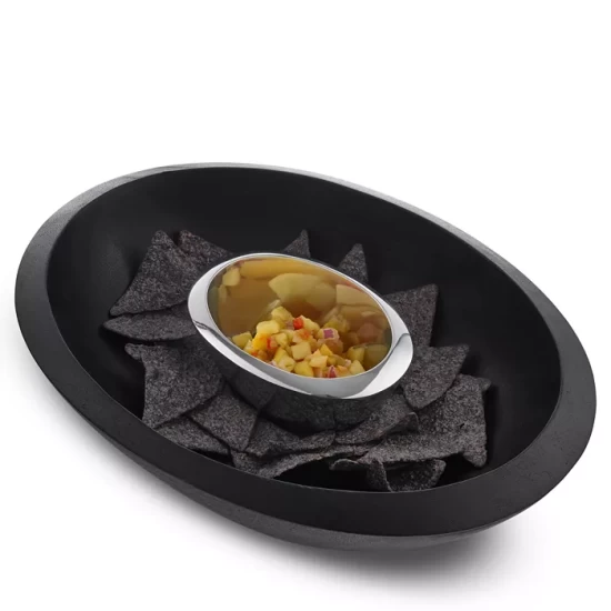 - The Chip & Dip’s oval shape and raised sides complement any table décor.