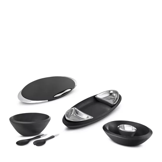 Appearing nearly black in color, the Nambé Noir Collection features a deep, rich stain on its acacia wood pieces, bringing a refined, contemporary look to Nambé’s signature designs. Gleaming Alloy accents add sleek contrast to the darkened wood.